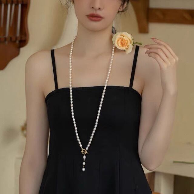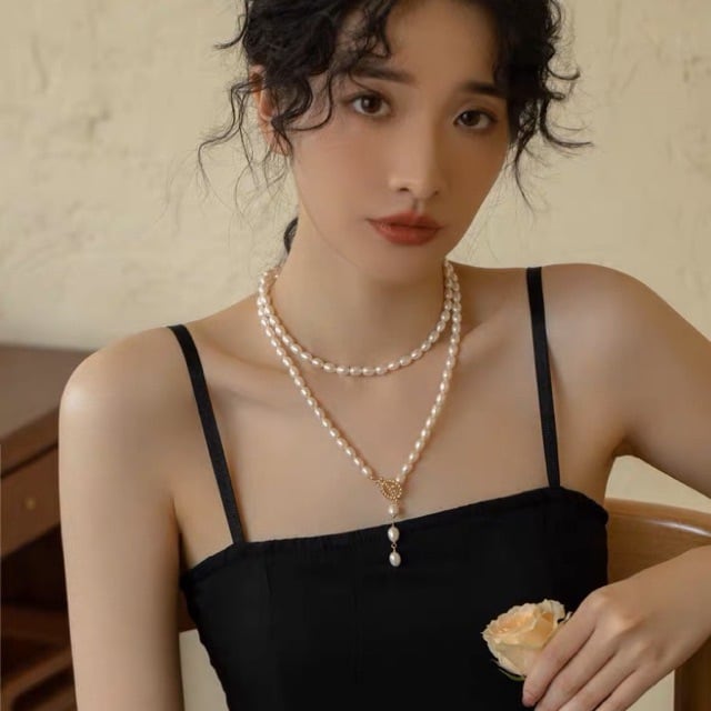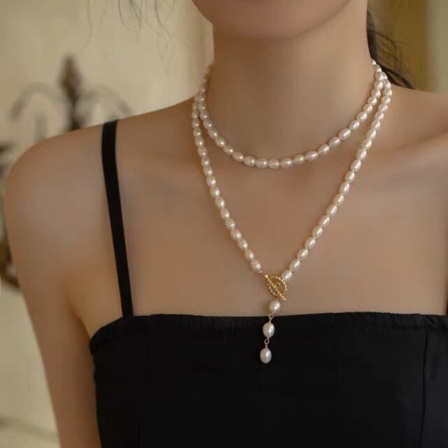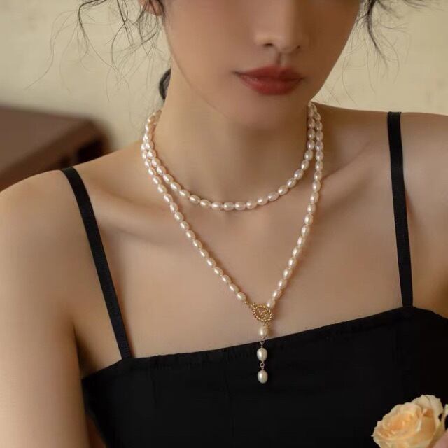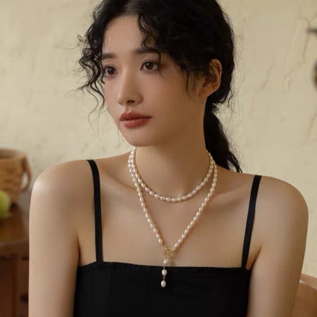 ファッションロングネックレス 天然淡水パールネックレス ダブルレイヤー鎖骨チェーン セーター用ネックレス チャイナドレス用ネックレス レディースファッション
