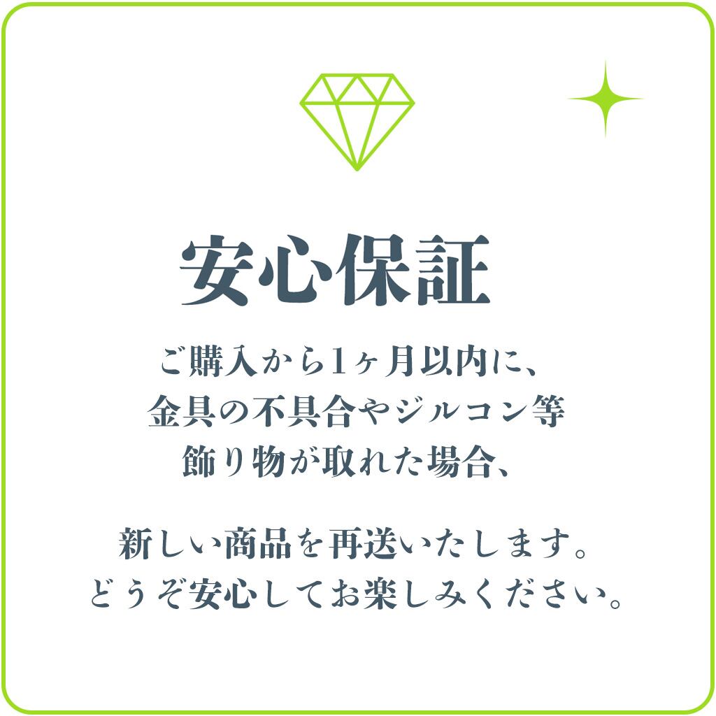 ご購入から1ヶ月以内に、金具の不具合やジルコン等飾り物が取れた場合、新しい商品を再送いたします。どうぞ安心してお楽しみください。♡♡♡